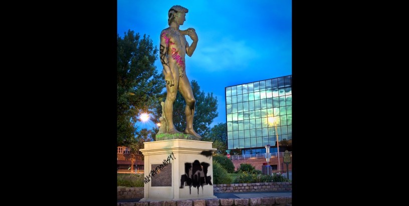 David’s rock-hard, bronze bottom was graffitied early Thursday as local fat protesters believe his body type is “unrealistic” for today’s standards.